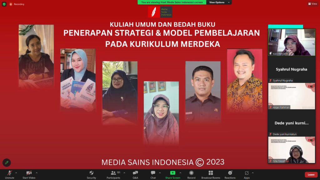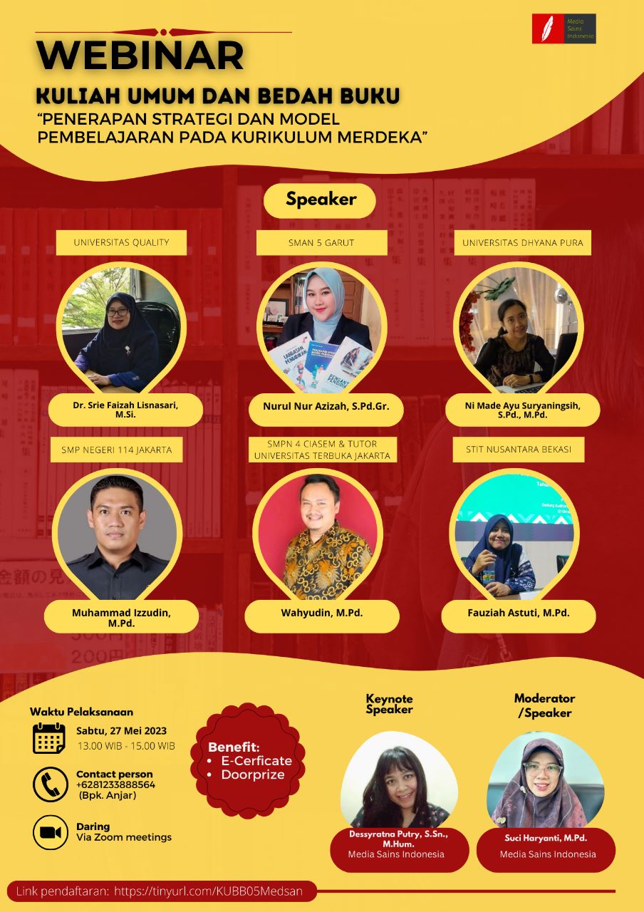 Pada tanggal 27 Mei 2023, Penerbit Media Sains menyelenggarakan kuliah umum dan bedah buku “Penerapan Strategi & Model Pembelajaran pada Kurikulum Merdeka”. Acara ini diselenggarakan dalam rangka memajukan mutu Pendidikan di Indonesia serta meningkatkan literasi dan kebermanfaatan serta mengulik isi buku yang sudah diterbitkan oleh Penerbit Media Sains. Terdapat 2 Buku yang di bedah dalam acara ini. Yang pertama yakni ”Penerapan Strategi dan Model Pembelajaran pada Kurikulum Merdeka” dan yang kedua ” Penerapan Model Pembelajaran pada pelajaran MIPA”.