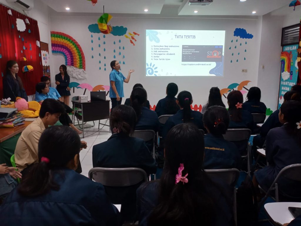 Kegiatan yang berlangsung pada Rabu, 3 September 2025 ini diikuti oleh seluruh mahasiswa baru Program Studi PG-PAUD dan bertempat di Universitas Dhyana Pura. Sosialisasi ini merupakan bagian dari rangkaian PKKMB tingkat program studi yang bertujuan membekali mahasiswa baru dengan pemahaman tentang hak, kewajiban, serta mekanisme pelaporan jika mengalami atau menyaksikan tindakan yang merugikan di lingkungan kampus.